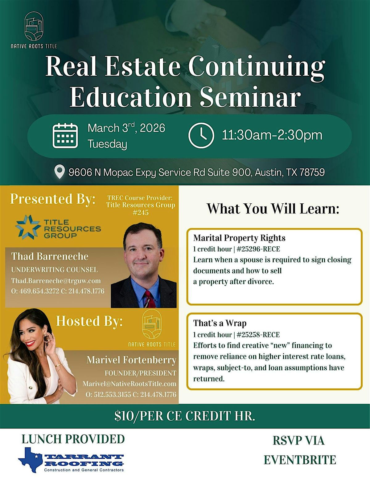 Join Native Roots Title for an in-person Real Estate Continuing Education seminar designed to provide practical, real-world insights for today’s market. This course covers key topics including marital property rights and creative financing strategies making a comeback in higher interest rate environments, such as wraps, subject-to transactions, and loan assumptions. Led by Title Resources Group underwriting counsel, attendees will earn CE credit while gaining valuable knowledge they can immediately apply to their business—all while enjoying lunch and networking with fellow real estate professionals.