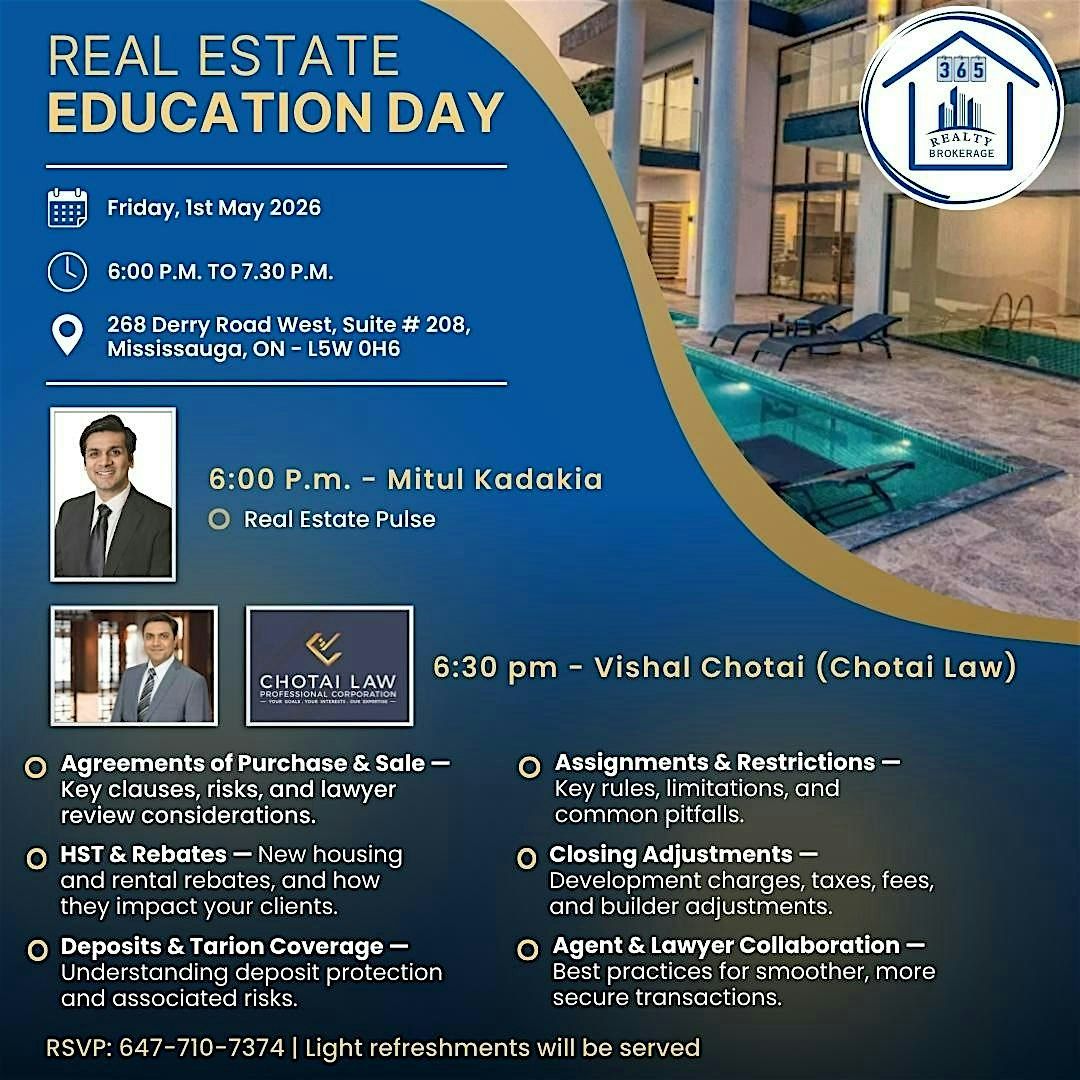 Join us for a free Real Estate Education Night hosted by 365 Realty Brokerage, featuring real estate expert Mitul Kadakia and real estate lawyer Vishal Chotai of Chotai Law Professional Corporation.