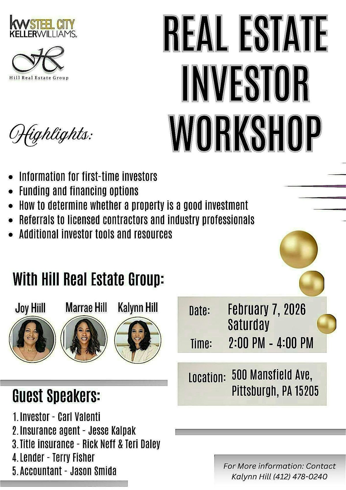 During this interactive workshop, you’ll hear directly from a seasoned real estate investor with a large portfolio, along with a trusted accountant, lender, title agent, and insurance agent—the core professionals every successful investor needs.