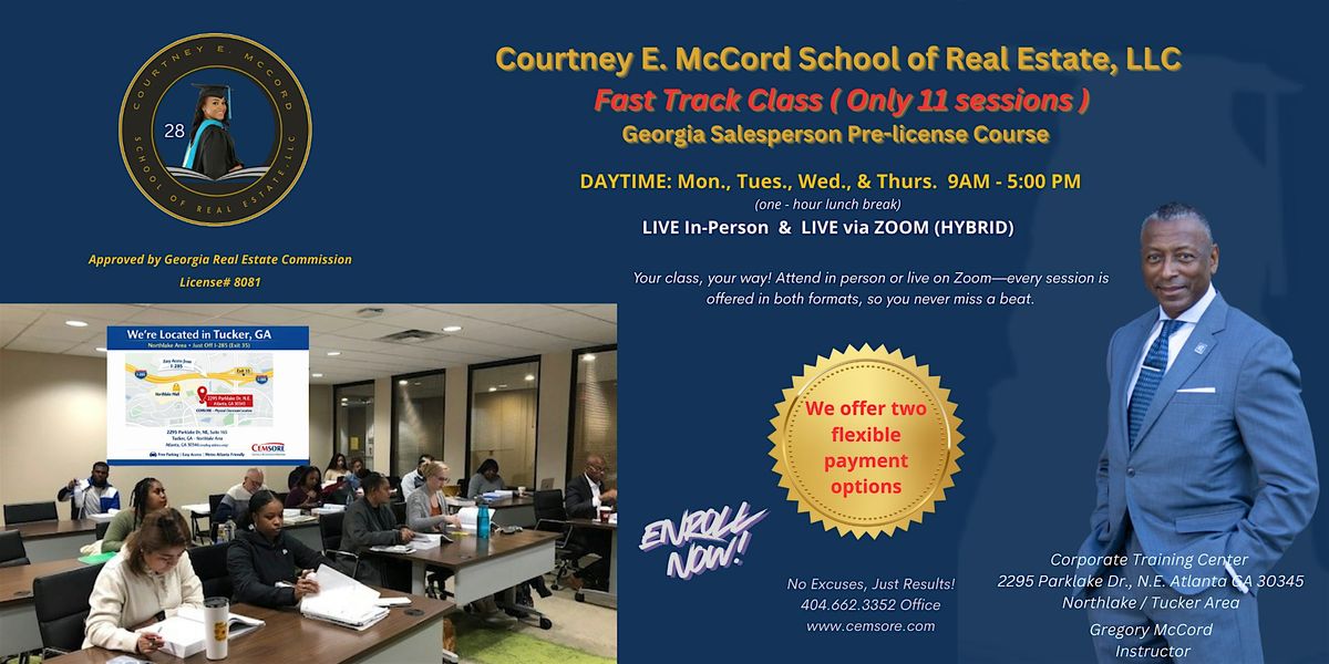 Earn your Georgia Real Estate License in just 11 days! Join CEMSORE’s Fast Track Hybrid Pre-License Class—LIVE In-Person & LIVE ZOOMAbout this Event