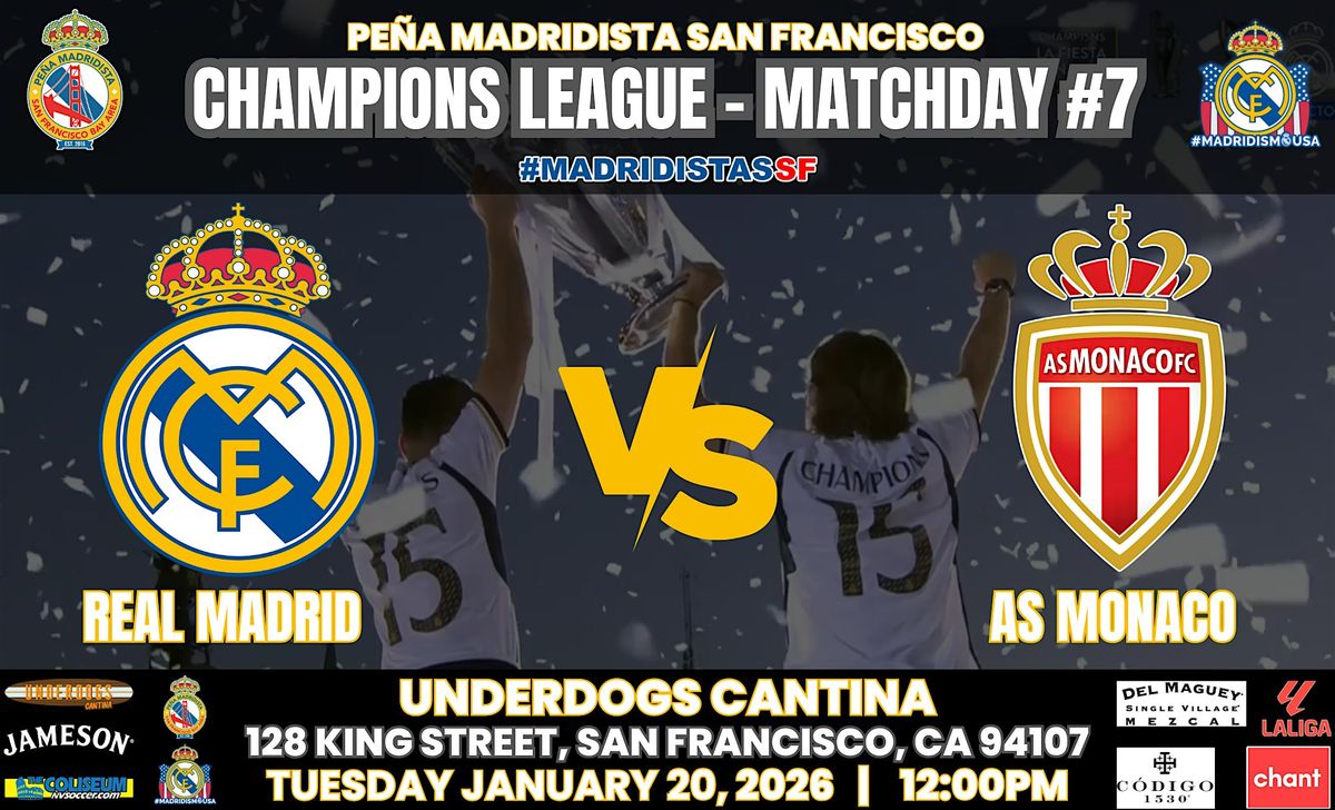 Peña Madridista San Francisco & Golden Road Brewing proudly invite you to join us at Underdogs Cantina to watch the UCL match between REAL MADRID vs AS MONACO.