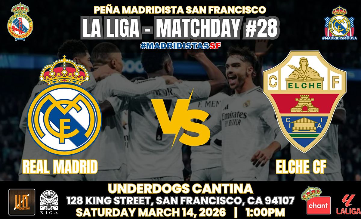 Peña Madridista San Francisco & Golden Road Brewing proudly invite you to join us at Underdogs Cantina to watch the LA LIGA match between REAL MADRID vs ELCHE CF.