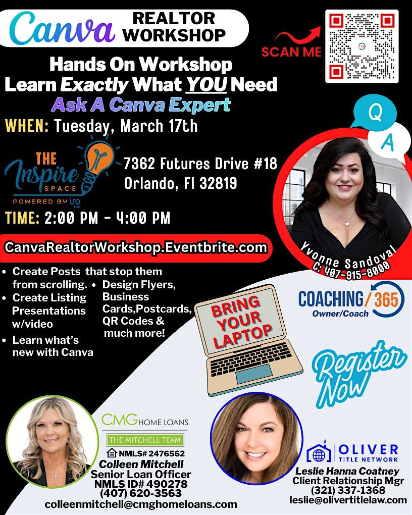 This class is being taught by Yvonne Sandoval, owner of Leverage 365, Coaching 365, and Video 365, located in Orlando, FL. She has created over 40,000 designs using Canva and provides marketing and coaching services to Realtors, Brokers, Mortgage, and Title companies throughout Florida.