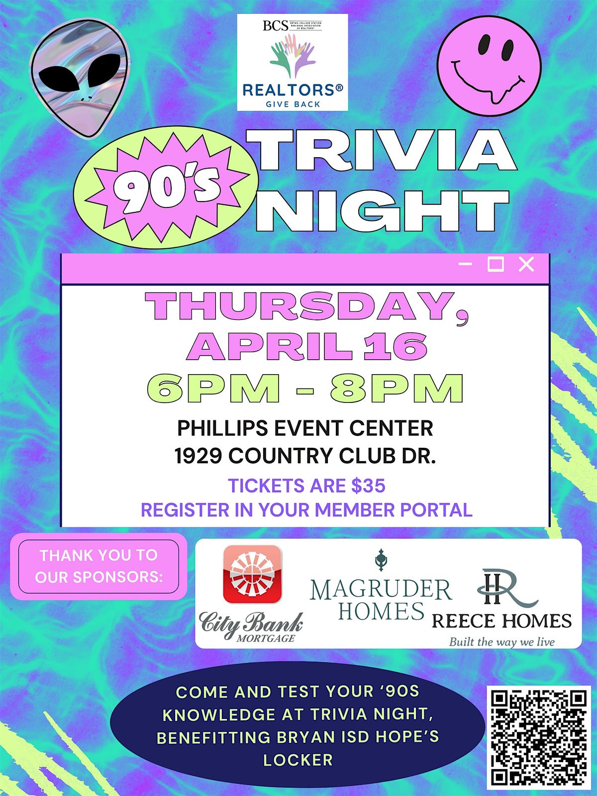 Get ready to dust off your flannel and bring your A-game at the #REALTORSGiveback 90s Trivia Night befitting BryanISD Hope's Locker! Join us in person for a totally rad evening filled with nostalgia, laughter, and friendly competition. Test your knowledge of all things 90s – from music and movies to pop culture and trends. It's the perfect chance to connect, have fun, and give back. Don’t miss out on this blast from the past!
