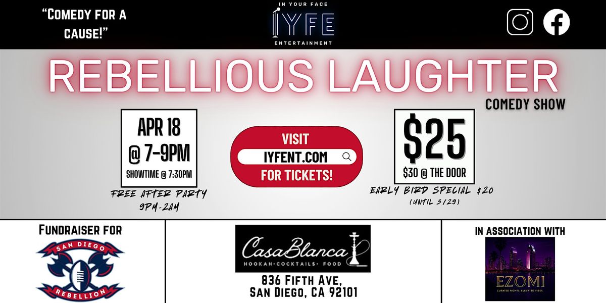 Join us on APRIL 18 from 7–9 PM at CasaBlanca Louge in San Diego, CA for night of "Rebellious Laughter" supporting the San Diego Rebellion Football team in associate with Ezomi Entertainment!