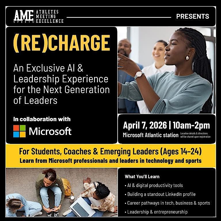 Join us for (RE)CHARGE: Spring AI & Digital Leadership Lab at Microsoft’s Atlantic Station location! This hands-on event is designed for student-athletes, college students, and emerging leaders ages 14–24 who want to boost their digital skills and career readiness.