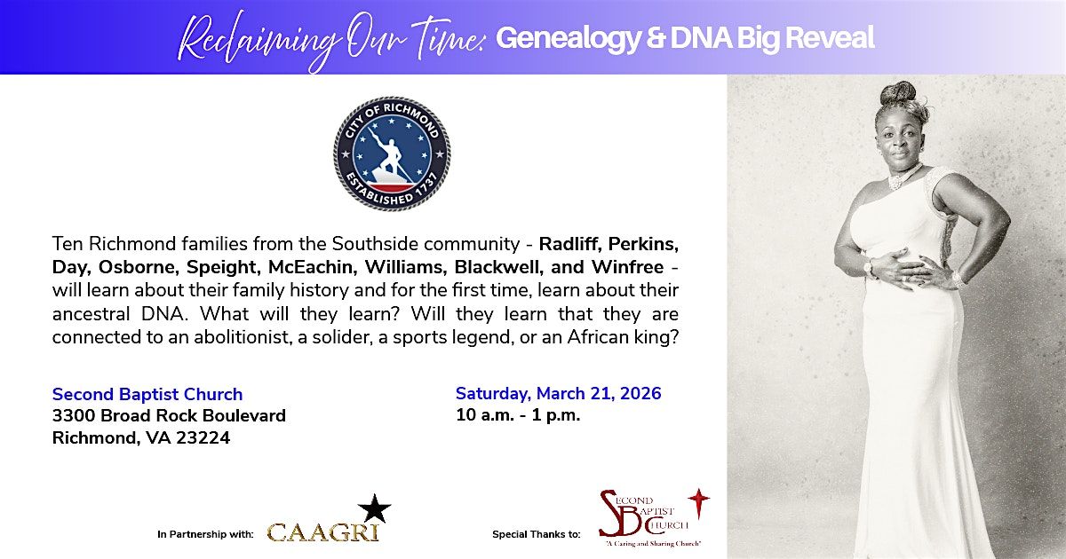 Join us as ten Richmond families from the Southside community- Radliff, Perkins, Day, Osborne, Speights, McEachin, Williams, Blackwell, and Winfree- will learn about their family history for the first time, learn about their ancestral DNA. What will they learn? Will they learn that they are connected to an abolitionist, a solider, a sports legend, or an African king?