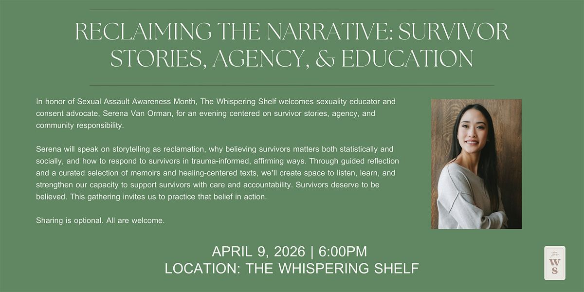 In honor of Sexual Assualt Awareness Month, The Whispering Shelf invites you to a guided evening with sexuality educator and consent advocate Serena Van Orman, centered on survivor stories, agency, and community.