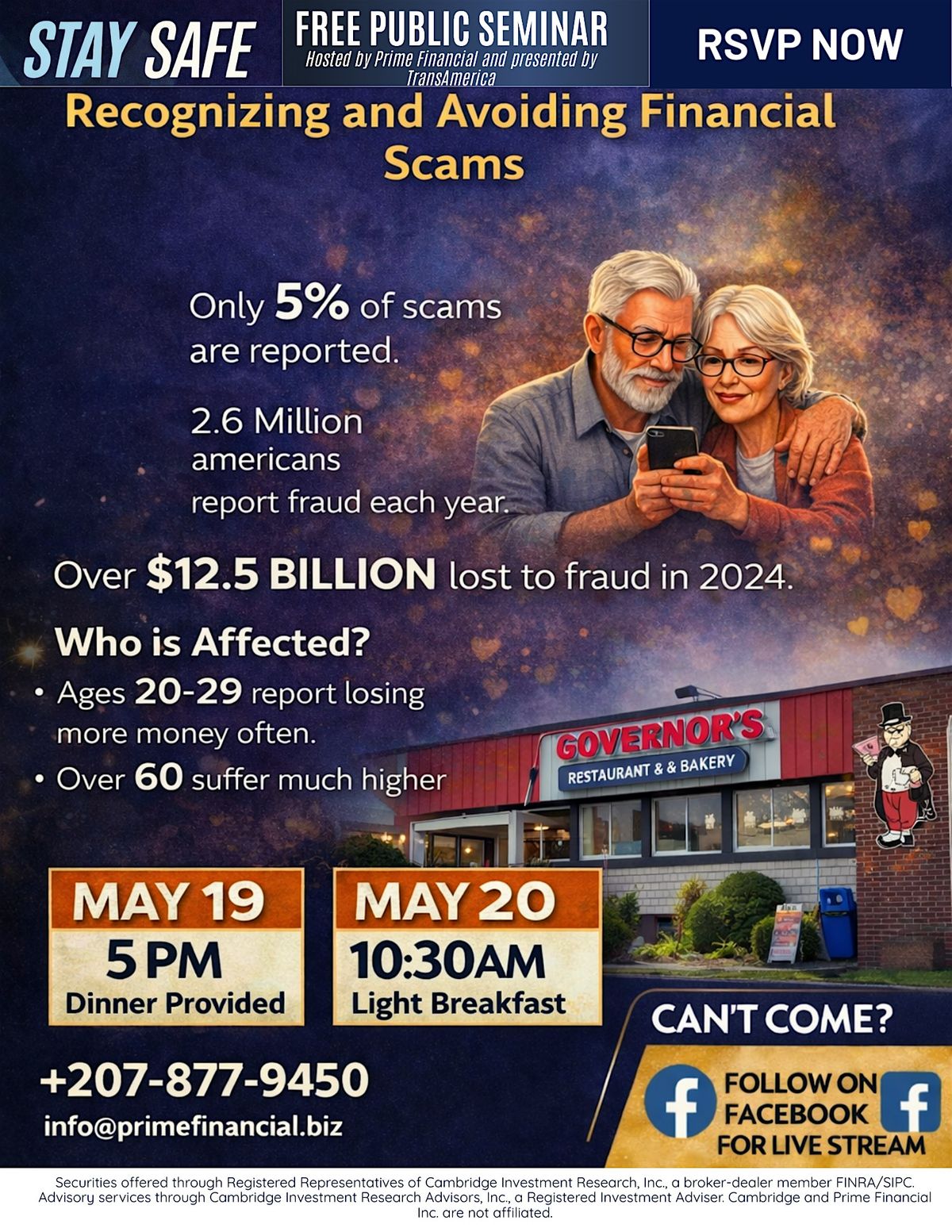 This free public seminar, hosted by Prime Financial and presented in collaboration with Transamerica, will provide valuable insights into the growing risks of financial scams - and how to recognize and avoid them.
