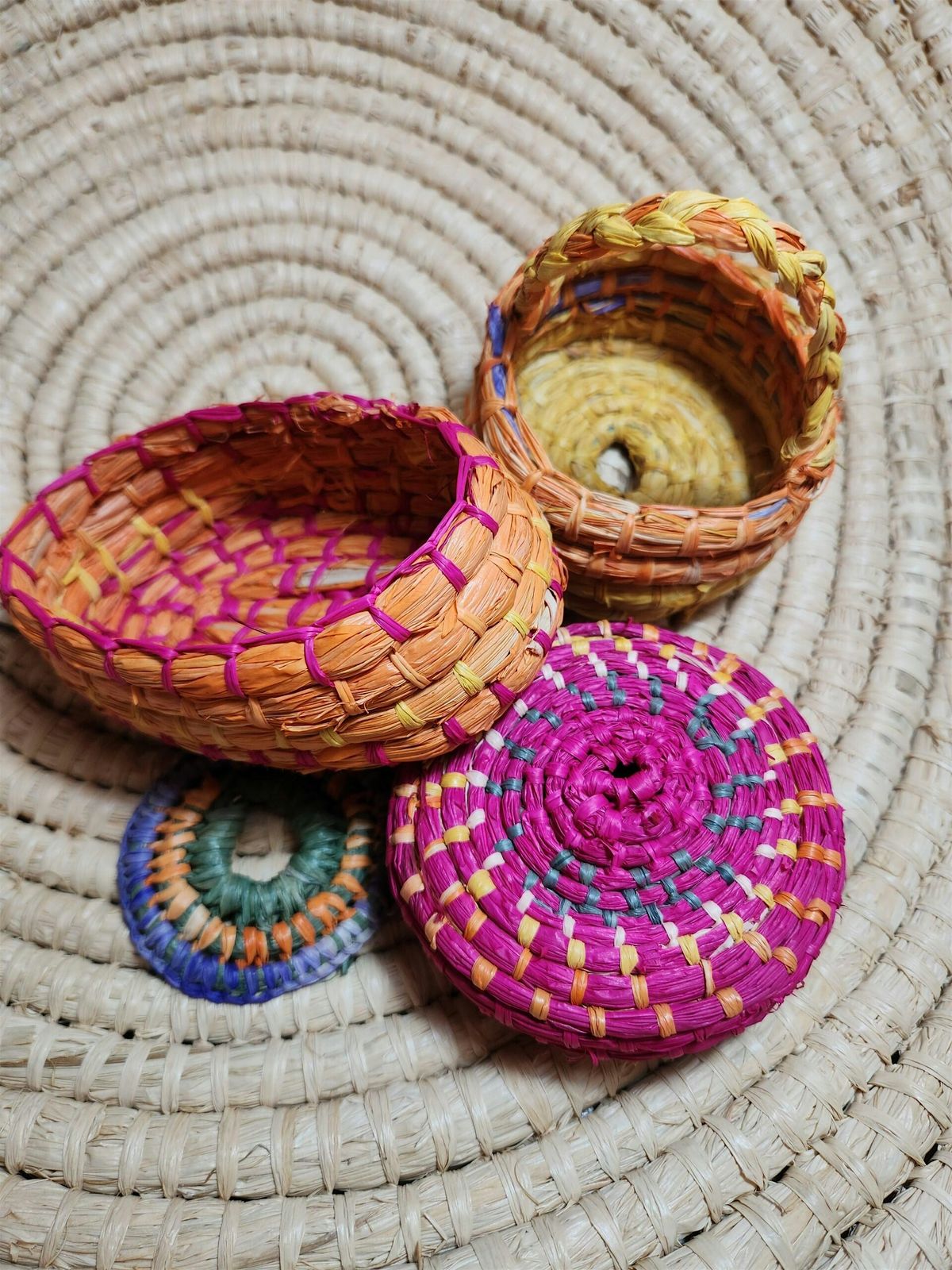 You will have the opportunity to make a pendant, a keyring, or a small handheld basket. Toni also generally gives the participants a needle or two and raffia to take home to finish their piece or start another one