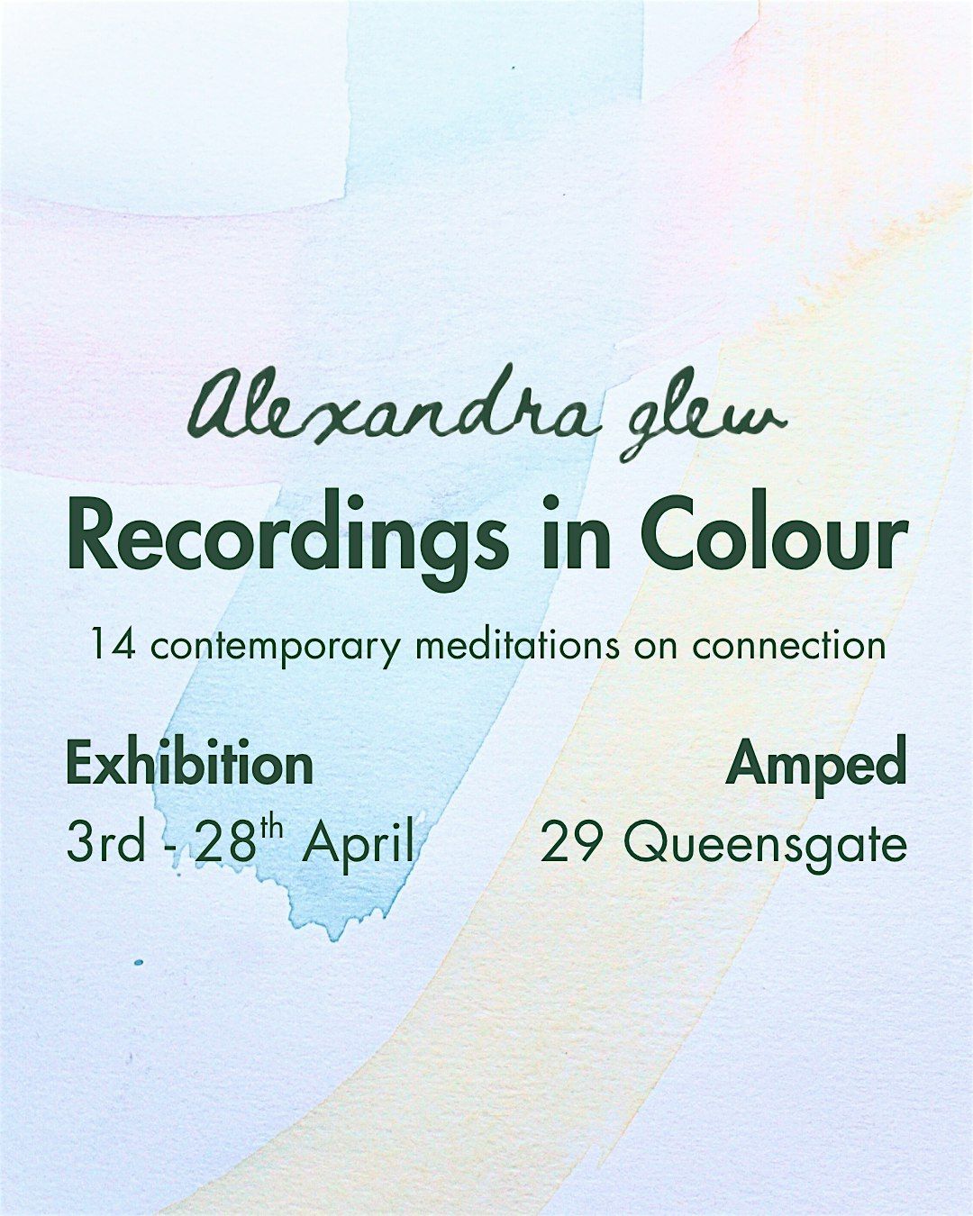 Recordings in Colour by Alexandra Glew brings together a series of 14 expressive abstract works, recordings of the sensory experience of moving through local landscapes—its shifting colours, fleeting weather, sounds and the quiet rhythms that shaped my connection to place.