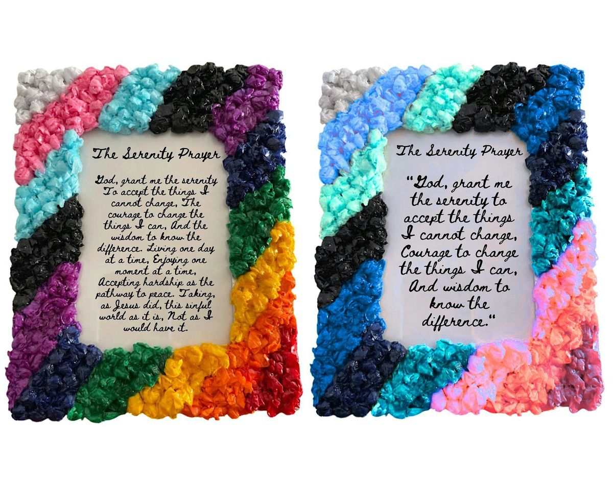 The Serenity Prayer, and empowering quotes are available to put in the window of the frame.