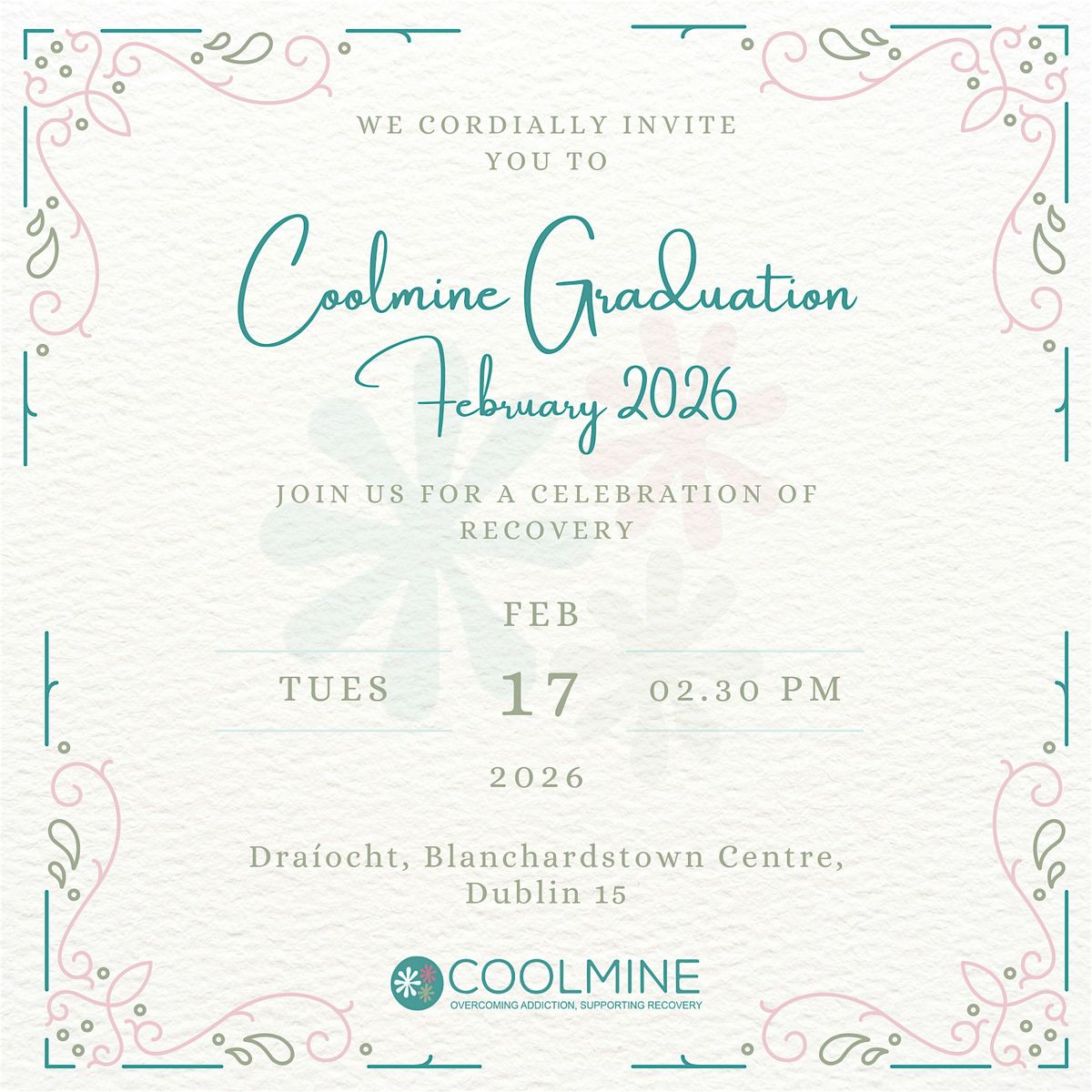 Join us in person to celebrate amazing achievements at the Coolmine Graduation this February! It's all about hope, strength, and the incredible journey of recovery. Come support graduates as they step into a brighter future. Don't miss out on this inspiring event!