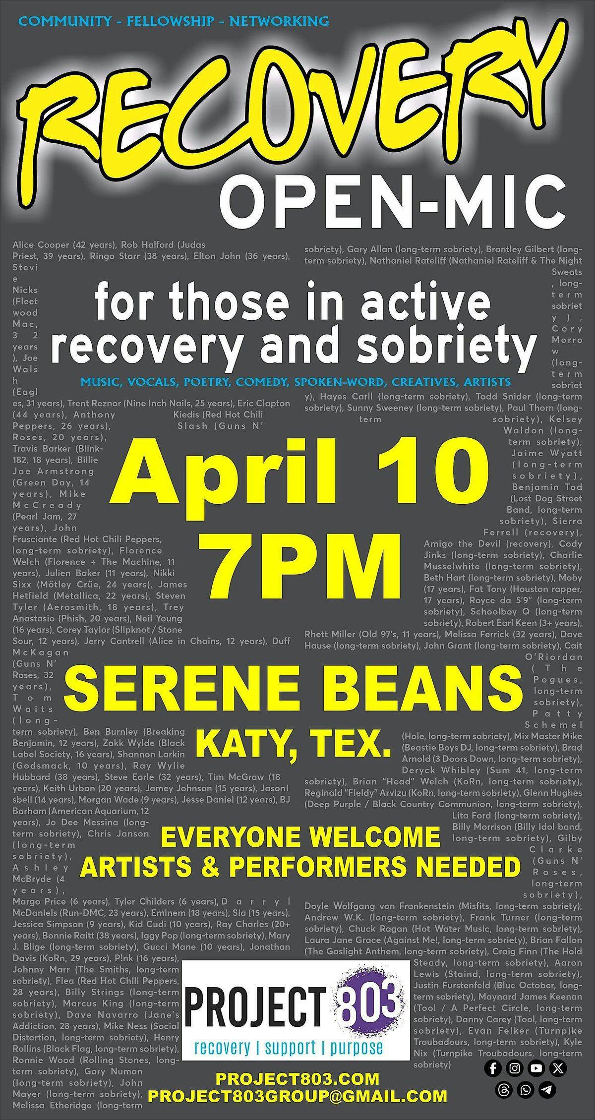 Join us for a fun-filled in-person night at the Recovery Open Mic! Whether you want to share your story, sing a song, or just enjoy some great performances, this is the place to be. Come connect, laugh, and heal with an awesome community. Grab the mic or cheer from the crowd – everyone’s welcome!