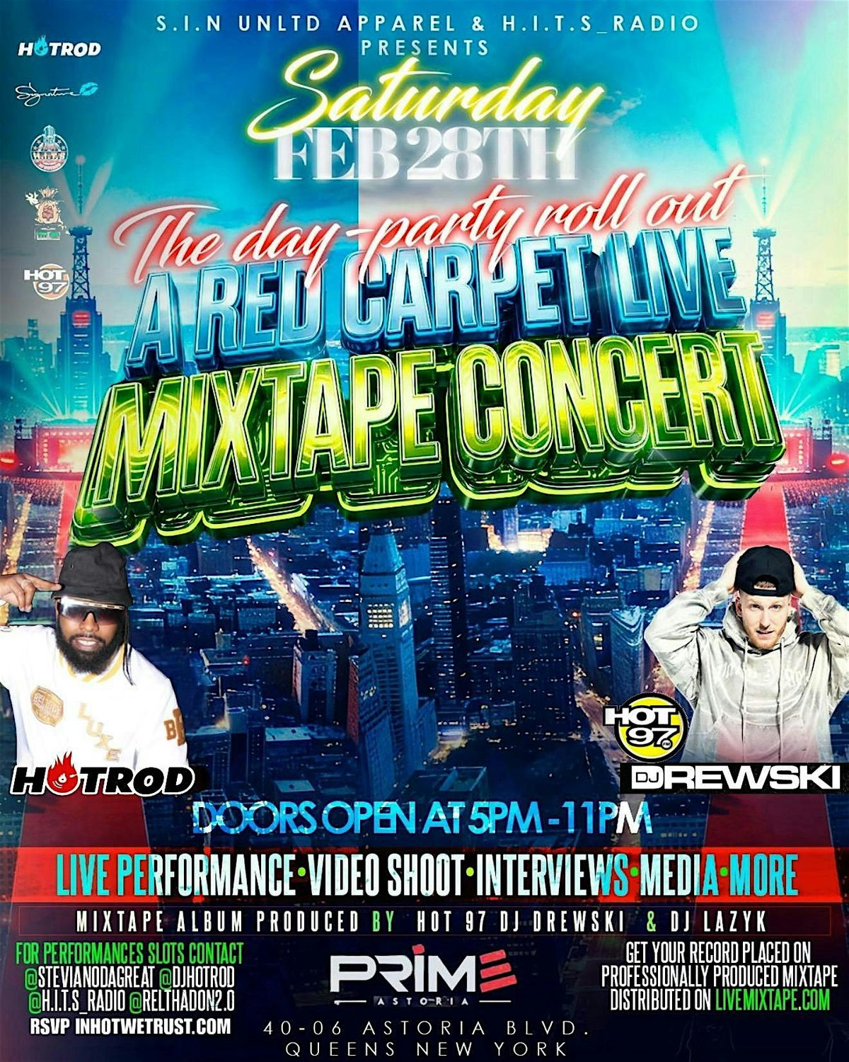 Epic Concert going down Sat Feb 28th Prime Astoria Queens NY Hot 97's own DJ Drewski Dj Hot-Rod and legendary DJ Lazyk breaking new talent