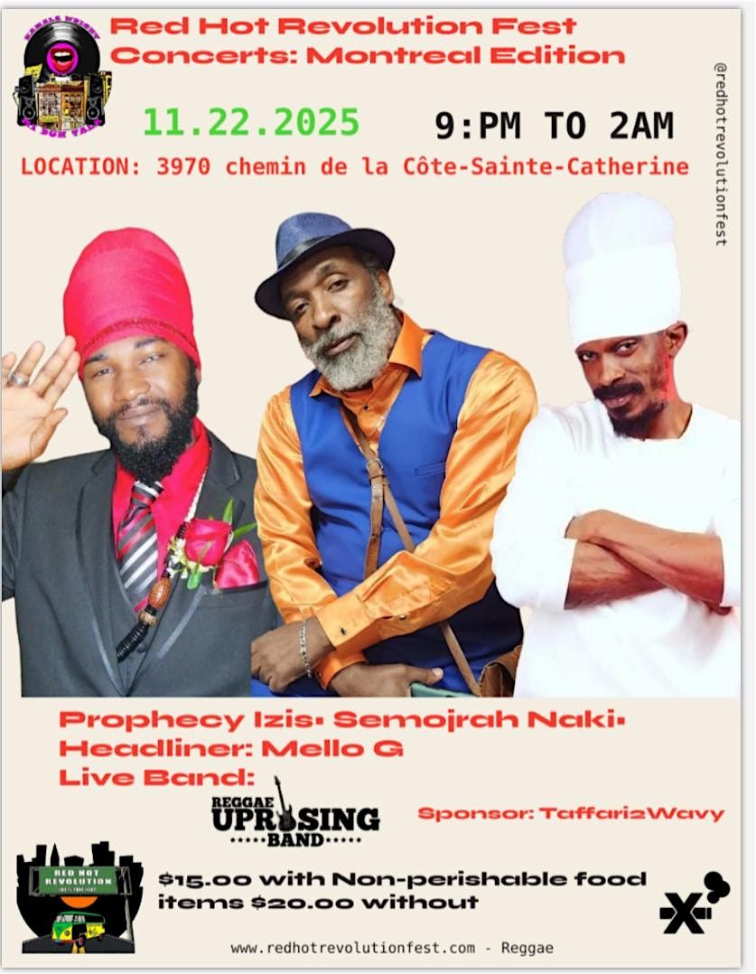 Mello G, Prophecy Izis, Semojrah Naki. Reggae Uprising Band; DJ Neo B at Saint Paul’s Anglican Church in Cote Des Neiges Montreal.Agenda