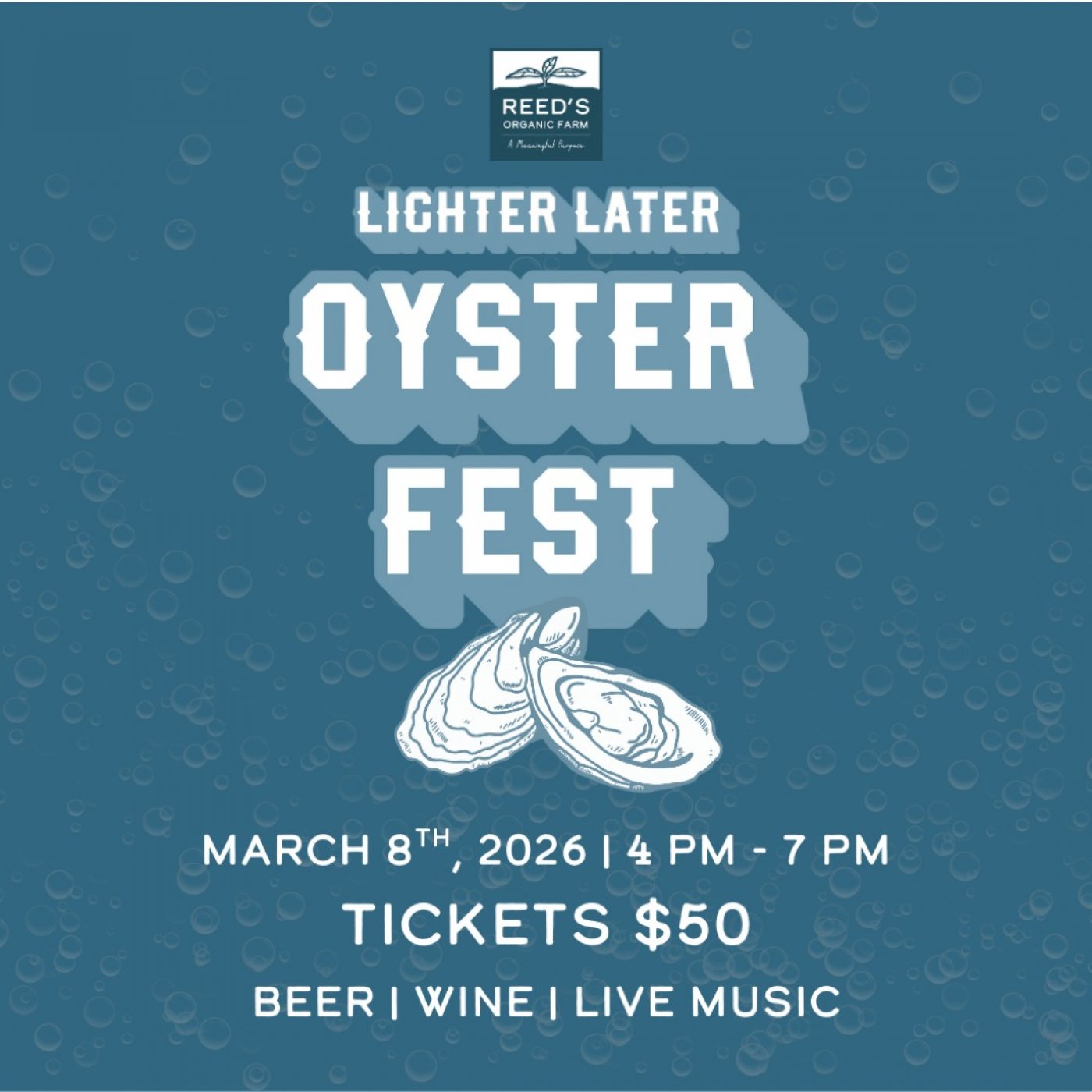Reed’s Farm invites you to join us at the Lighter Later Oyster Fest, taking place Sunday, March 8th, 2026 at Reed’s Farm from 4 PM - 7 PM! This outdoor event will bring people together to enjoy oysters from local fisheries, along with beer, wine, charcuterie, and live music, while supporting Reed’s Farm’s work to strengthen connections between people, the land, and local food systems.