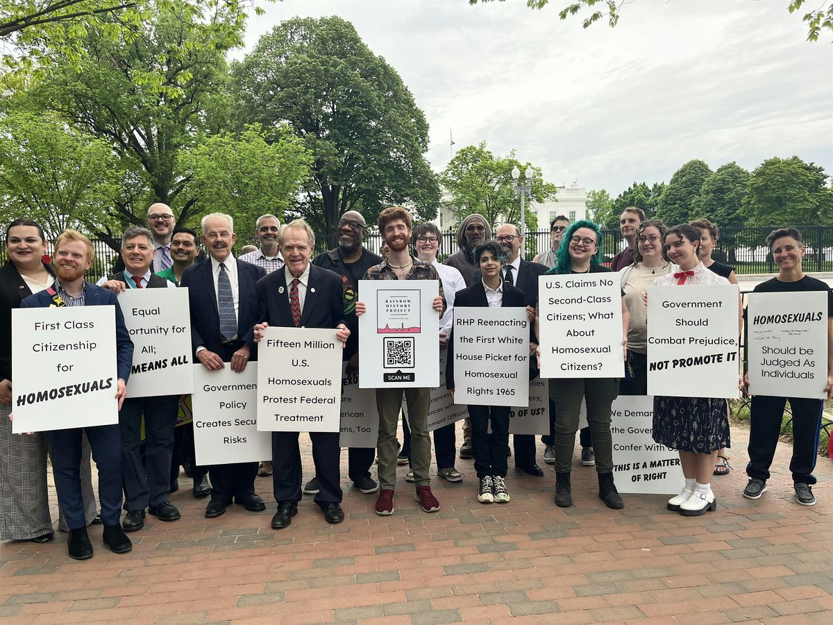 The Rainbow History Project will reenact the historic 1965 White House picket on its 61st anniversary. The reenactment will educate community members and the media on the demands of gay and lesbian activists from the early gay rights movement. RHP’s volunteers will carry replicas of the original protest signs and hand out literature explaining the picket to passersby and tourists.