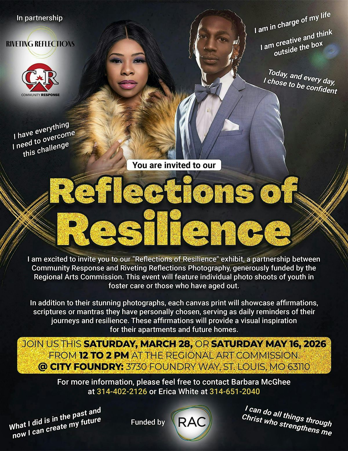 Join us at the St. Louis Foundry – Regional Arts Commission, Suite 149 for Reflections of Resilience on Saturday, May 16. Choose from two suggested entry times—12:00 PM – 2:00 PM or 2:00 PM – 4:00 PM—as we come together in honor of National Foster Care Month.