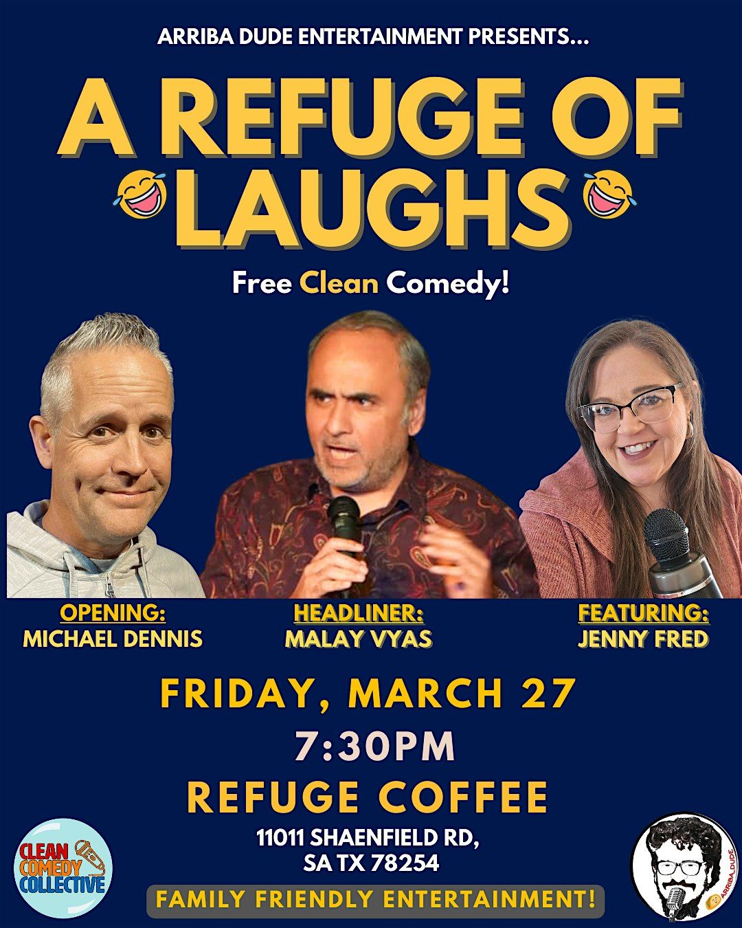 Get ready for a night of FREE, clean, laugh-until-your-face-hurts comedy , hosted by Arriba Dude Entertainment.We've got a fantastic lineup featuring comedians from across Texas!