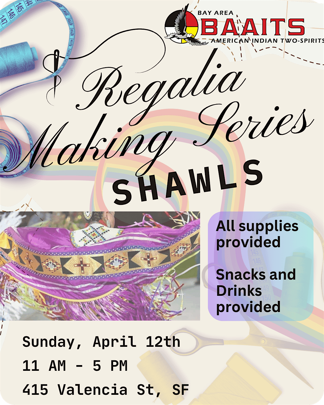 BAAITS invites Two-Spirit, IndigeQueer, and Indigenous LGBTQIA+ community members to join us for a hands-on shawl regalia making workshop. Whether you are beginning your regalia journey for the first time or continuing a practice that has been passed down through generations, this space is made for you.