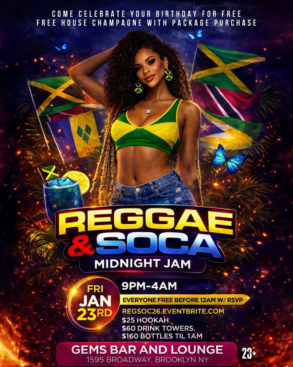 REGGAE & SOCA: MIDNIGHT JAM — Brooklyn’s hottest Caribbean night. Free before 12AM w/ RSVP. 9PM–4AM at Gems Bar & Lounge.About this Event