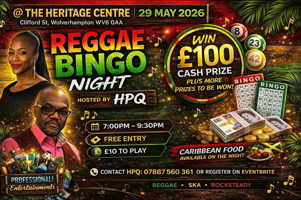 Get ready for a lively night of Reggae & Bingo at the Heritage Centre! Join us in person for a fun-filled evening filled with catchy reggae tunes and exciting bingo rounds. Whether you’re a bingo pro or just here to vibe with the beats, this event is all about good times and great company. Don’t miss out on the fun – come sing, dance, and play your way to amazing top prize of £100, quiz and raffle prizes, plus more!