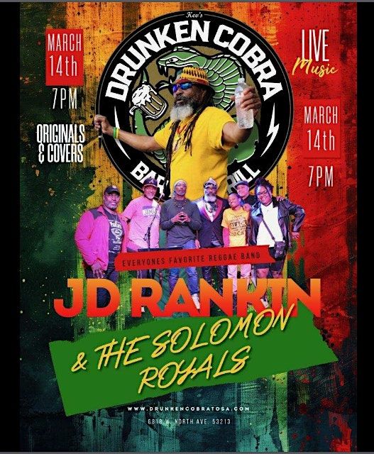 JD Rankin & The Solomon Royals return to the hottest spot in Tosa for a punky reggae party on March 14th at the Drunken Cobra Bar and Grill! Come join in the fun and get your groove on with this talented crew of musicians. Musical line up includes Cory Coleman, Deon Sartin, Stu Dove, Malcolm Ramsey Jr., Deonte Ellis, Keshena Armon aka Ms. Blu Shuga and the one and only JD Rankin from Ocho Rios, Jamaica.