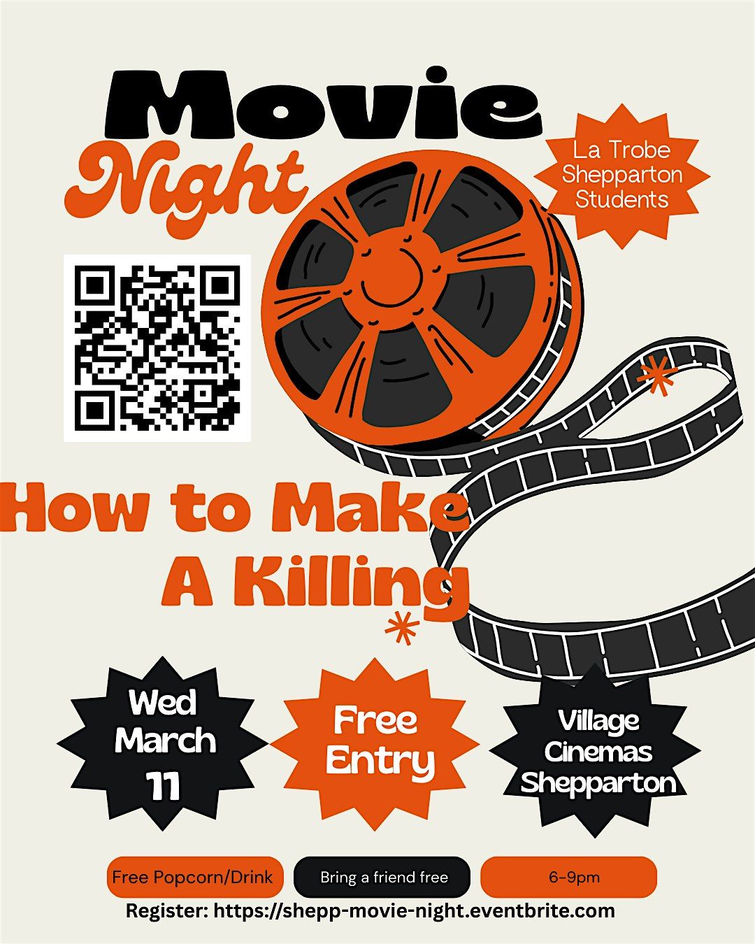 As a La Trobe Shepparton student, we would like to welcome you by offering a fun night out, on us to see How to Make a Killing. Your booking gets you up to 2 tickets and snacks, so bring a friend and enjoy meeting fellow students and staff who look forward to welcoming you to the La Trobe community.