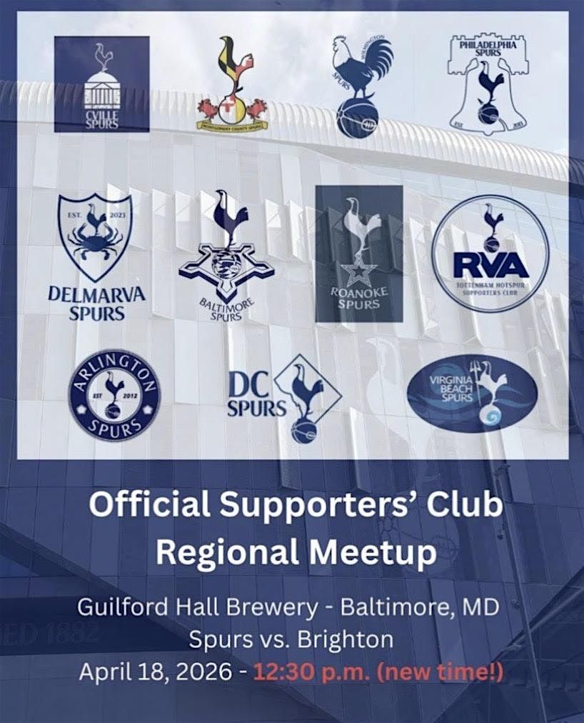 This event will bring together official Spurs supporters' clubs from across the region for a day of football, fun, and community — this includes clubs from Arlington, Baltimore, Charlottesvile, Delmarva, DC, Montgomery County, Philadelphia, Richmond, Roanoke, Virginia Beach, and Wilmington.