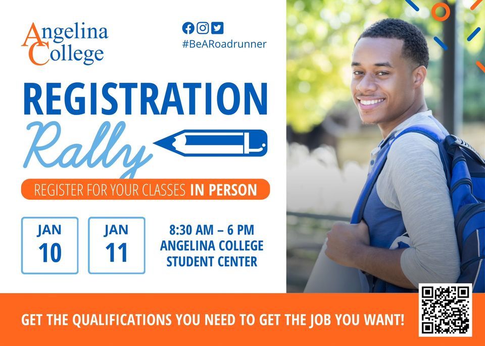 Students: Register for classes in person at Angelina College’s Spring Registration Rally! Our team will be on-hand to answer your questions and guide you through the registration process.We’ll be using the following schedule: