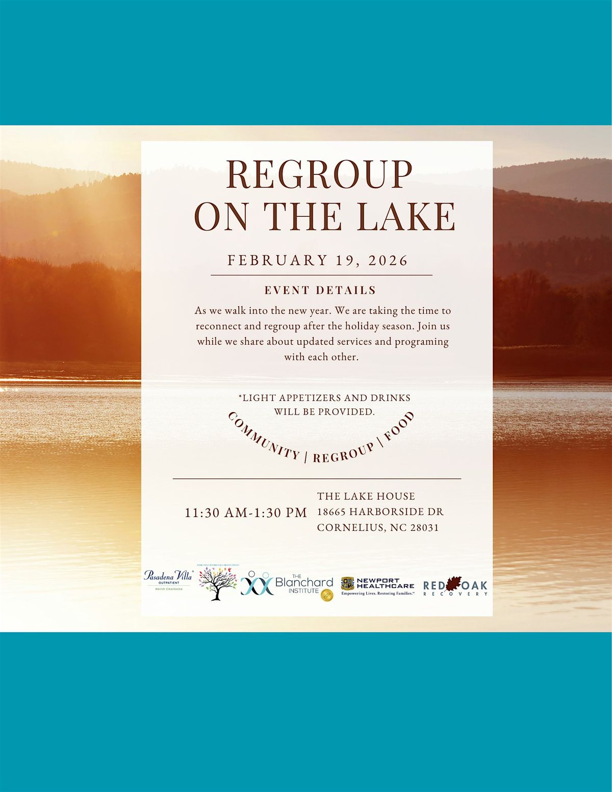 Regroup On the Lake is a special event happening at The Lake House restaurant. Join us for a day filled with reconnecting, good vibes, and beautiful views. Let's come together to discuss updated services and programming. This in-person event will be a great opportunity to regroup with others. We are looking forward to seeing you soon.