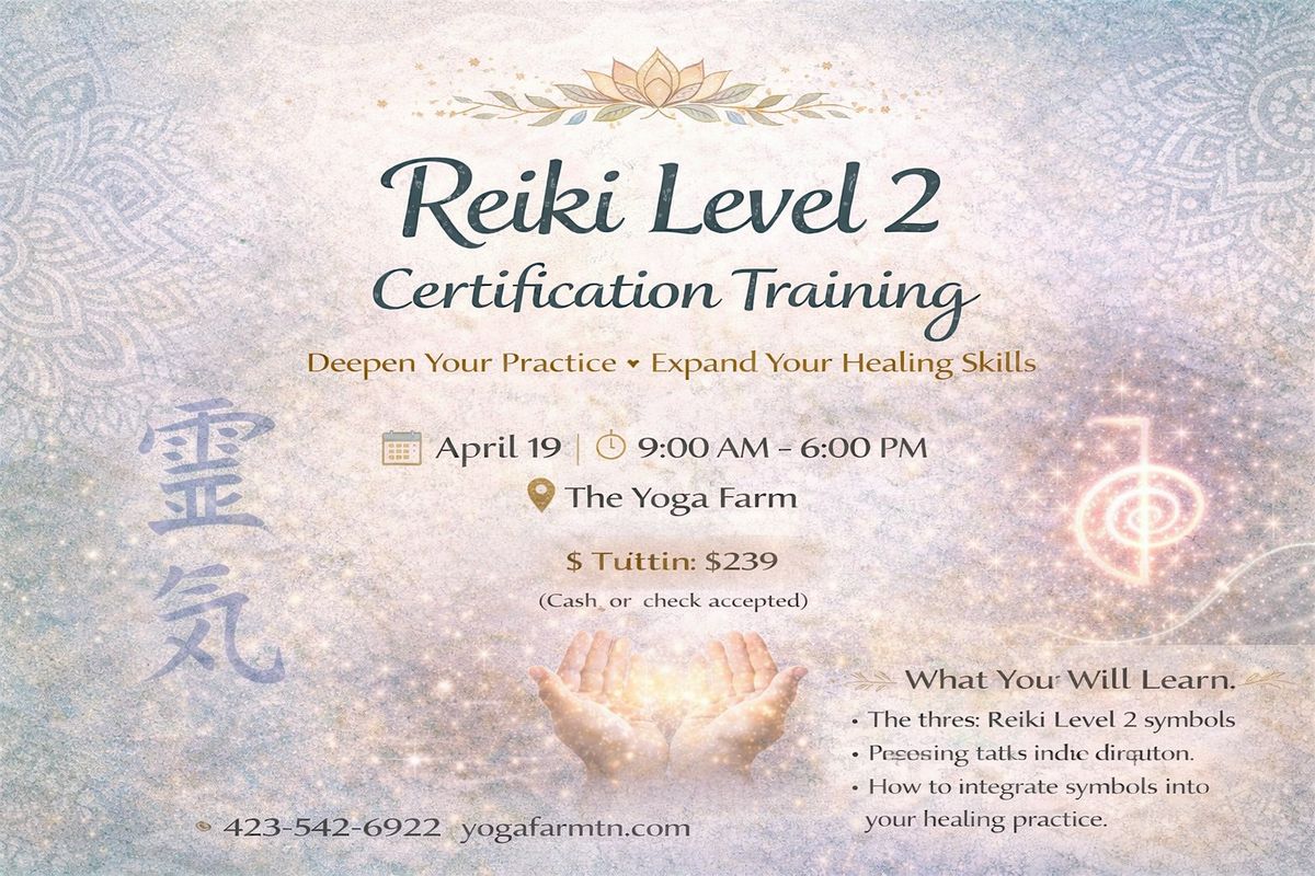 Reiki Level 2 Certification TrainingThis Reiki Level 2 Training is an opportunity to deepen your understanding of Reiki energy, expand your healing skills, and step more fully into your personal or professional Reiki practice.April 19th