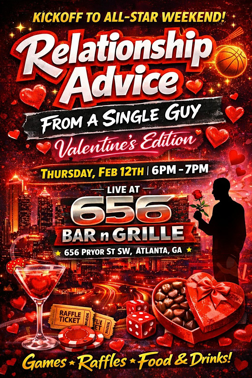 Welcome to the Relationship Advice From a Single Guy Podcast Valentines Show! Join us at 656 Sports Bar & Grille on February 12, 2026 at 7:00 PM (Eastern Time) for a night of laughter, love, and insightful advice. Whether you're single, in a relationship, or just looking for a fun time, this event is for you! Get ready to hear hilarious stories and valuable tips from our host. Don't miss out on this special Valentine's event - bring your friends and enjoy a fantastic evening!
