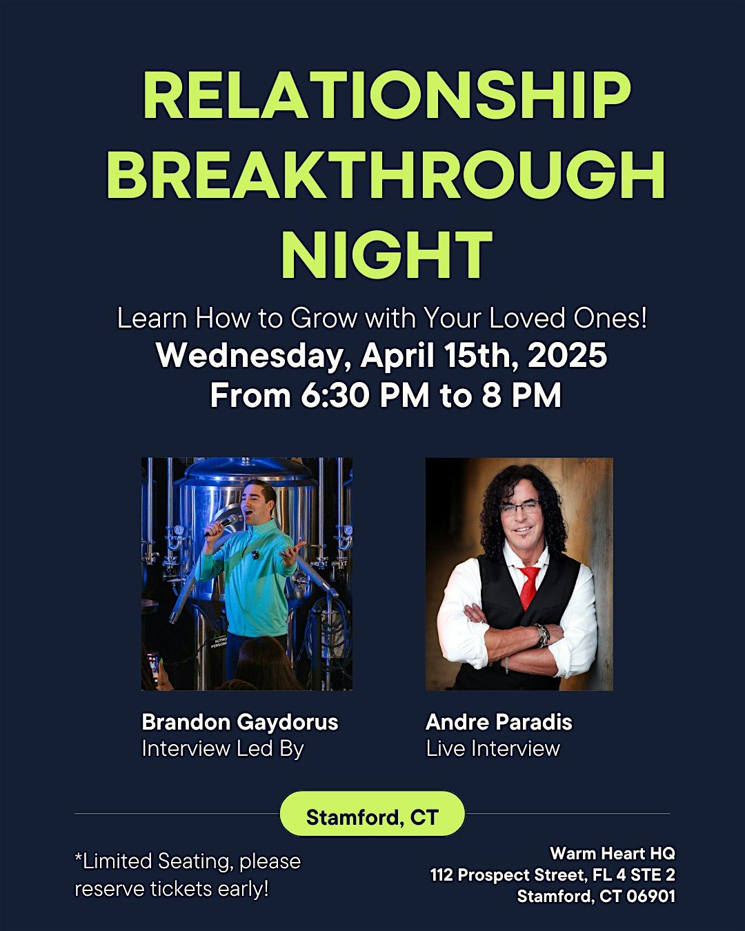 Throughout this evening, you can expect breakthroughs in ways to grow your relationships through a live Q&A with World-Renowned Relationship Coach Andre Paradis! Brandon Gaydorus will host the live interview and invite the audience to ask questions!
