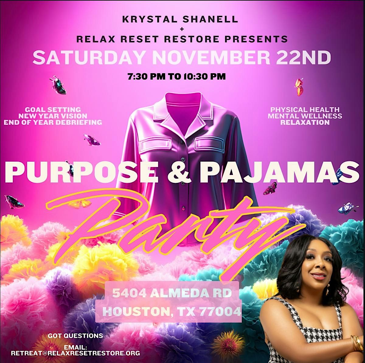 Come join us for a night of ultimate relaxation and rejuvenation at our Pajamas & Purpose Party! Put on your comfiest pajamas and get ready to unwind at 5404 Almeda Rd. It's time to relax, reset, and restore your mind, body, and soul. Connect with like-minded individuals and discover your true purpose in a cozy and welcoming atmosphere.