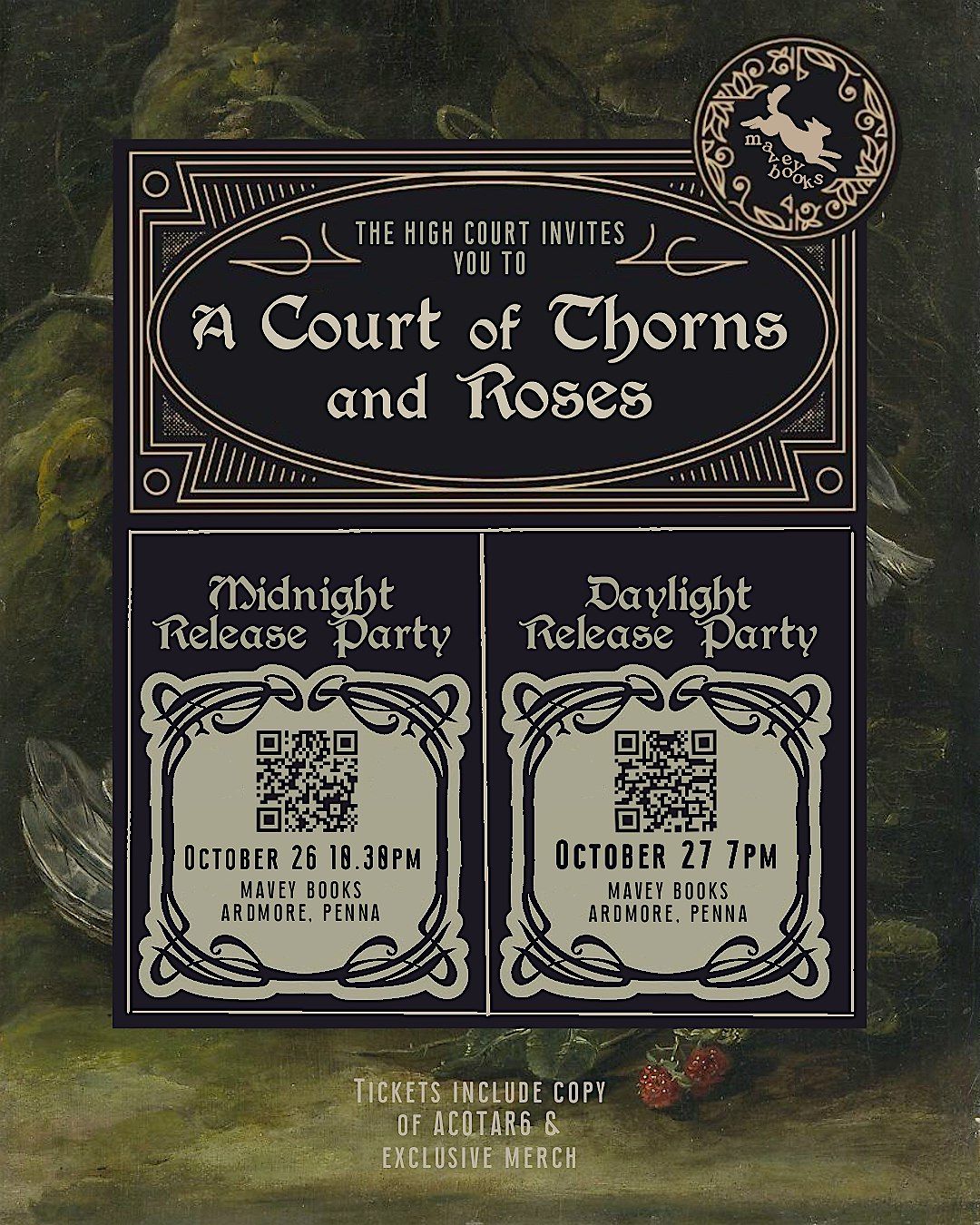 The High Court invites you to A Court of Thorns and Roses Daylight Release Party. Join Mavey Books for a Daylight Release Party celebrating book 6 in the A Court of Thorns and Roses series. This event will take place at Mavey Boaks 8 Cricket Ave, Ardmore Penna on October 26, 10.30PM.