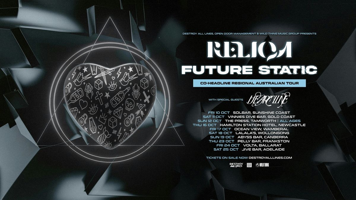 Destroy All Lines, Open Door Management and Wild Thing Music Group proudly presents Reliqa & Future Static co-headline Australian regional tour.Touring together for the first time ever, both Reliqa and Future Static will embark on their biggest run of Australian headline shows yetSleek, polished and “inextricably modern” (Wall of Sound), Sydney's Reliqa are taking progressive metalcore to new heights. The band's late-2022 EP 'I Don’t Know What I Am' proved their worthiness for the world stage, catching the attention of critics and labels alike and leading ultimately to their signing with Nuclear Blast and Greyscale Records in 2023 with their debut album of 'Secrets of the Future' release in 2024 Reliqa have joined international frontrunners including Spiritbox, Babymetal, Halestorm and Silent Planet live in concert, with a commanding, level-headed presence that has won the hearts of devoted fans in Australia and beyond.Melbourne five-piece phenomenon Future Static are one of Australia’s most talked about breakthrough heavy acts, creating a unique synthesis of alternative, melodic, and progressive metalcore. Future Static’s debut 2023 album ‘Liminality’ charted #1 on the Australian AIR Independent Album charts, with extensive touring including supporting Babymetal, Electrical Callboy, Jinjer, Enter Shikari, Atreyu, Memphis May Fire and TesseracT. Led by their breathtaking lead vocal tandem, a magical chemistry of bassist Kira Neil and electrifying front-woman Amariah Cook, and backed by the band’s swagger and blazing fury, Future Static have taken Australia’s live circuit by stormJoined by special guests Heartline on all shows, tickets are available through destroyalllines.com