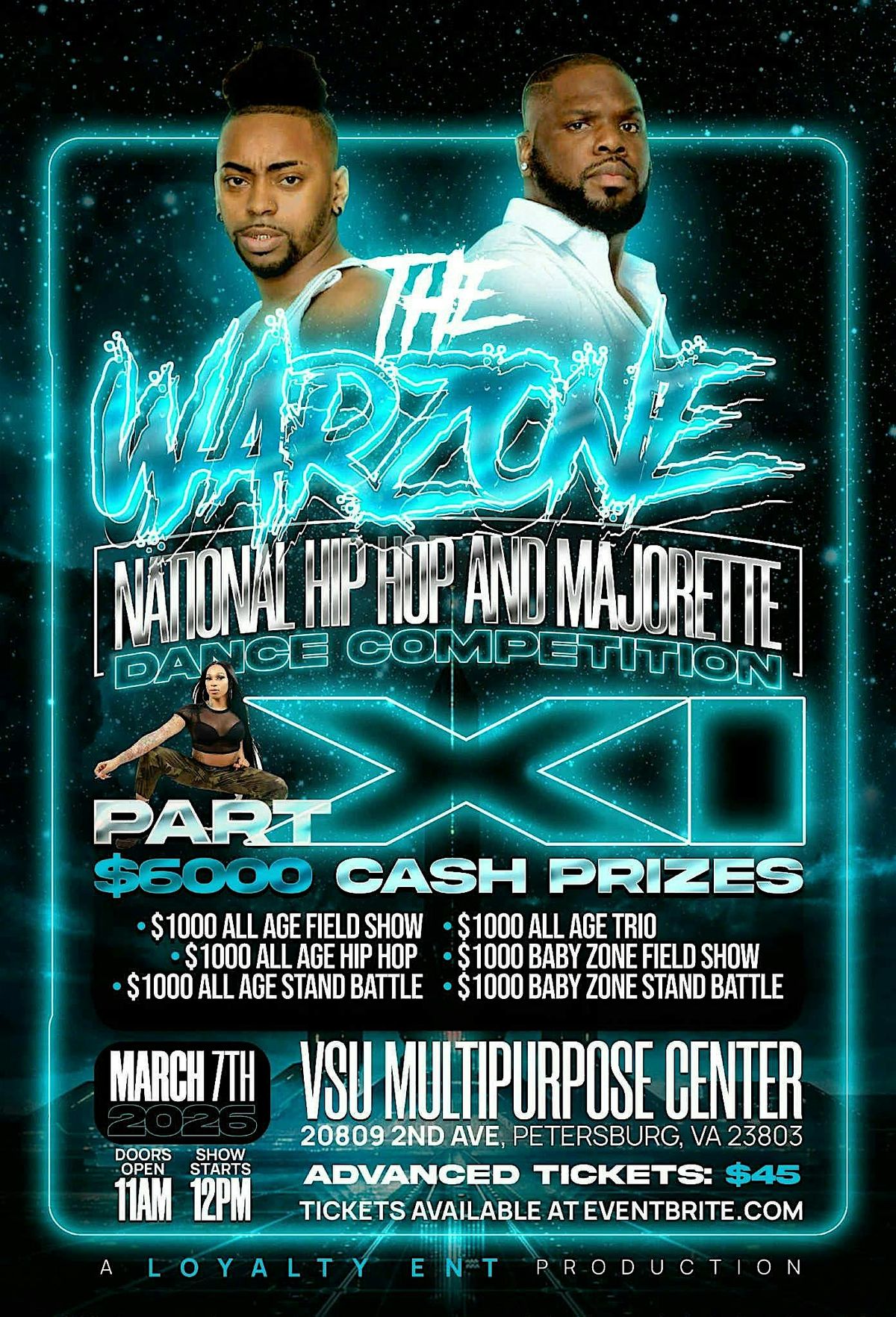 WE WILL BE HAVING A TWO DAY EVENT THAT TAKES PLACE ONCE A YEAR.TEAMS PREPARE FOR MONTHS TO COMPETE. THIS SHOW IS LIKE NO OTHER SOME SAY ITS THE AMERICAS GOT TALENT OF DANCE. TONS OF FUN THAT THE FAMILY CAN ENJOY.THE ARENA IS THE LEGACY ARENA STATE OF THE ART ARENA .WE WILL BE AWARDING 10,000 IN TWO DAY FOR WINNERS!!!