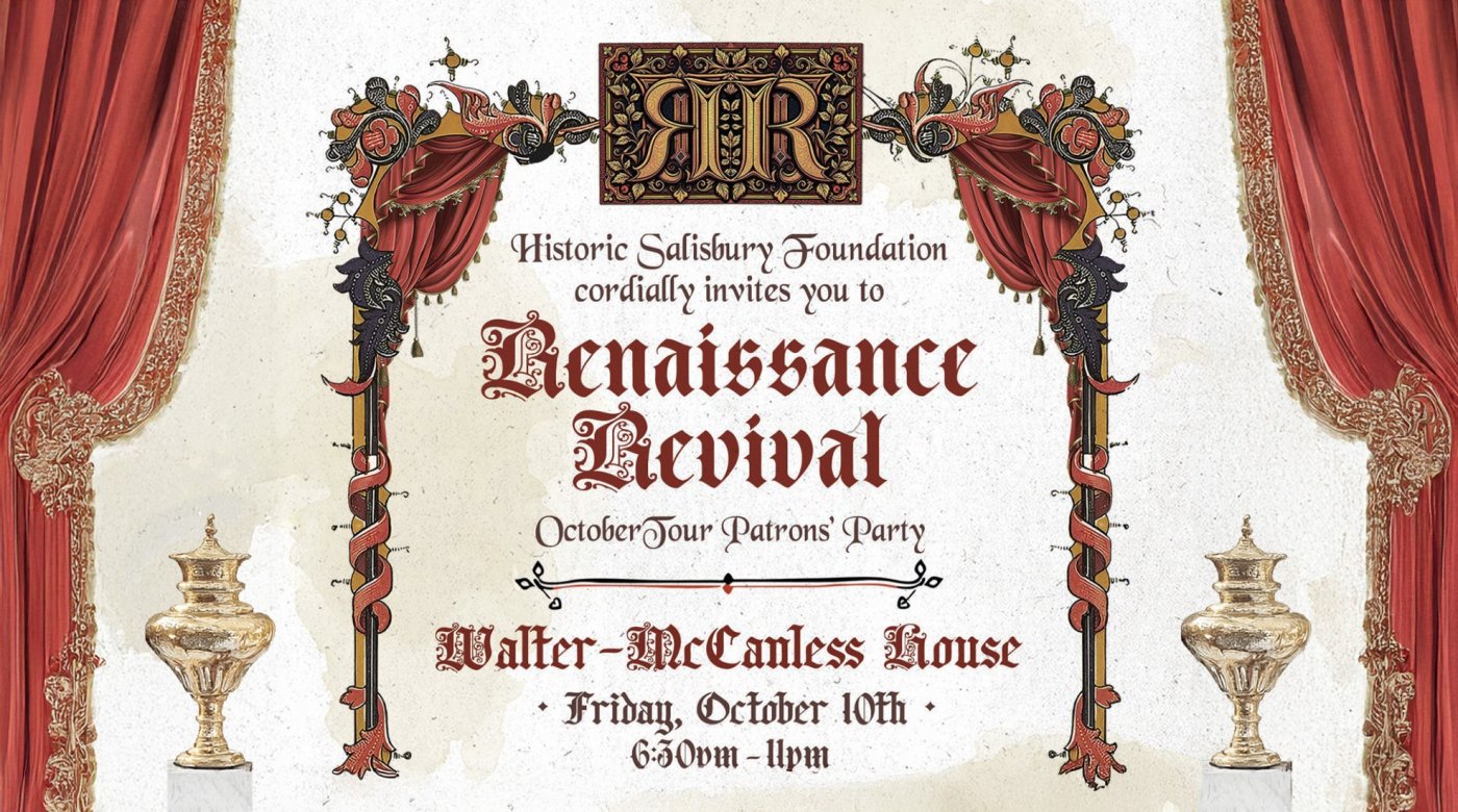Join us for the 50th Annual OctoberTour Patrons’ Party on Friday October 10 from 6:30pm to 11pm at The Walter-McCanless House.This year’s theme is Renaissance Revival in which brings a night of art architecture live entertainment cocktails and celebration inside one of Salisbury’s most stunning homes hosted by Seamus and Traci Donaldson.