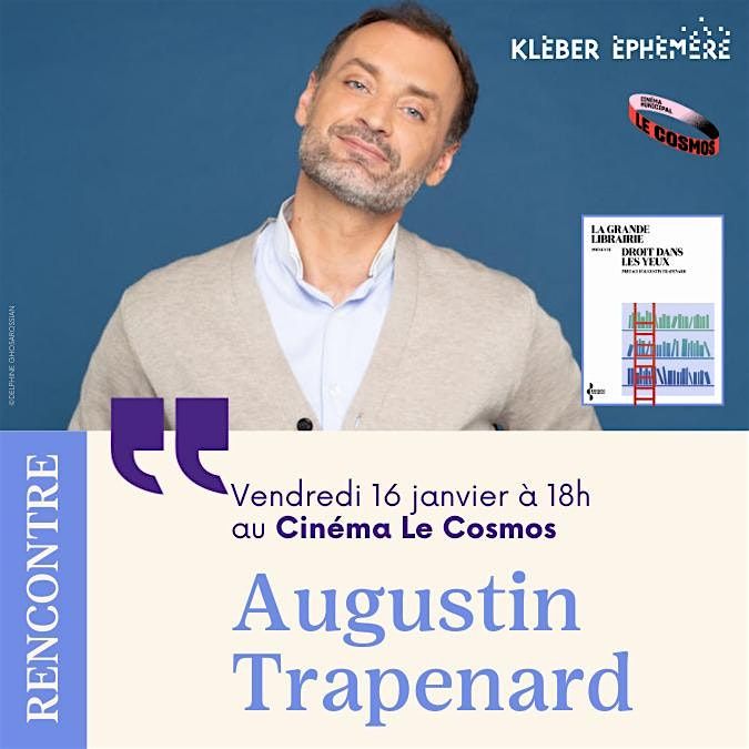 Événement gratuit sur inscription via notre site internet, billetterie ci-dessus Pour débuter l’année 2026 en beauté, une rencontre exceptionnelle avec Augustin Trapenard, autour du livre Droit dans les yeux publié aux éditions Seghers. Pour cette occasion, la rencontre aura lieu dans la grande salle du cinéma Le Cosmos suivie d’une séance de dédicaces au 1er étage du cinéma.