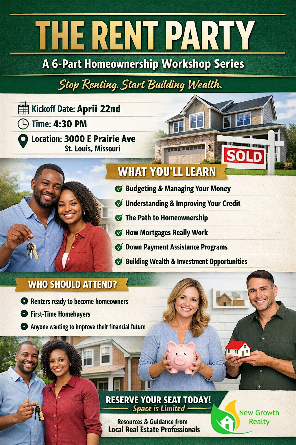 This 6 part series will put you on the path to homeownership. You will gain access to tools, resources and information that will take you from a renter, to a homowner, to investor. Come party while investing into yourself.