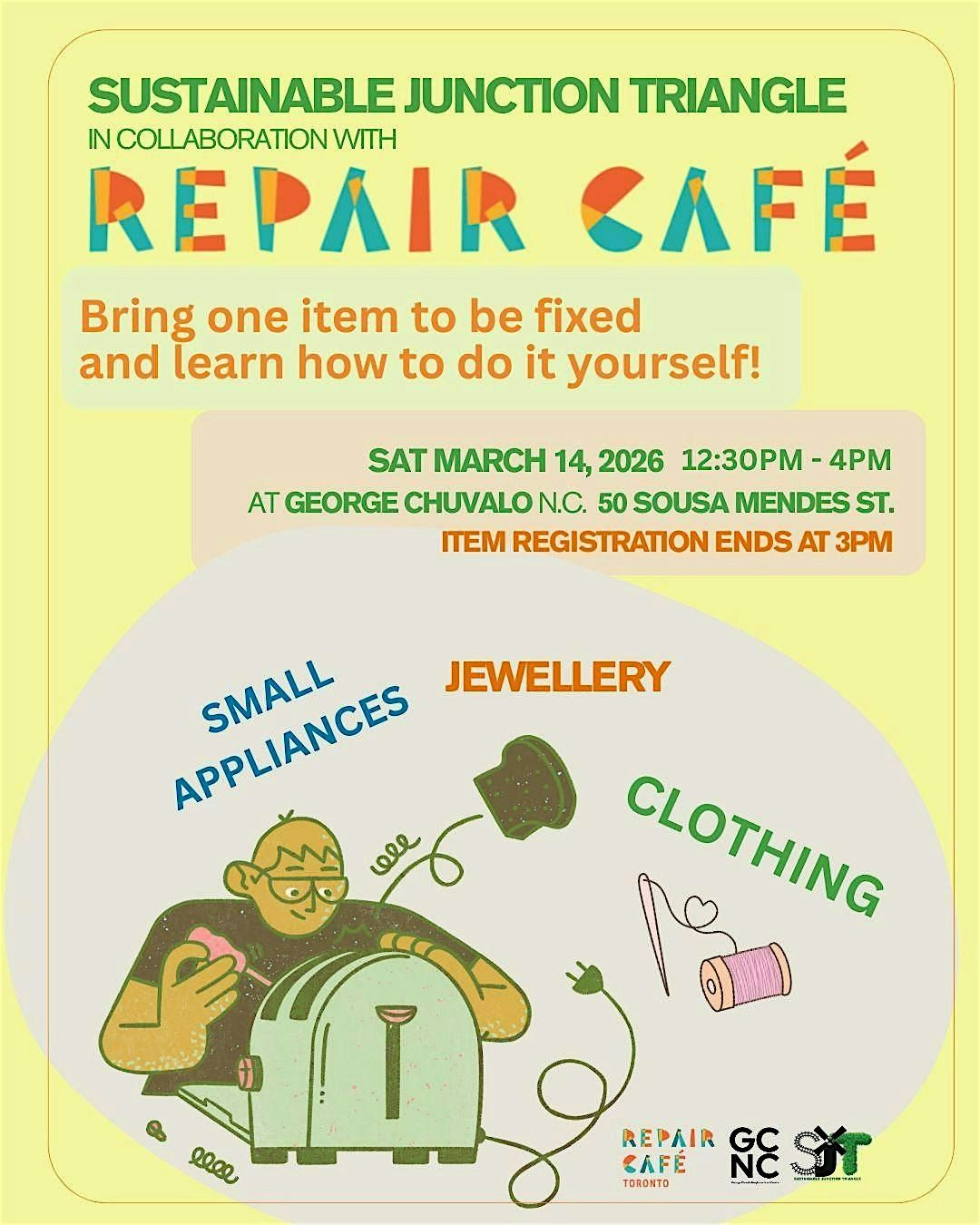 - Items left with Sustainable Junction Triangle in Collaboration with Repair Café Toronto must be retrieved within one week. Otherwise they will be donated or recycled as appropriate.