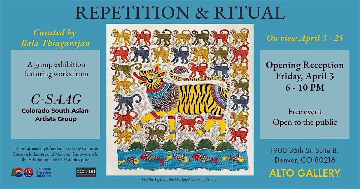 Repetition & Ritual is a group exhibition featuring 30 artworks by from the Colorado South Asian Artists Group (C-SAAG). The exhibition explores how repeated gestures, patterns, and processes create meaning in art. Across media—including painting, photography, sculpture, and mixed media—artists use pattern, iteration, and rhythmic structures to build visual language and presence.
