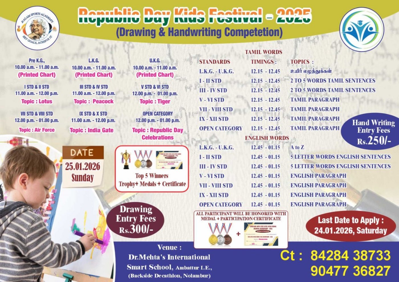 Republic Day Kids Festival Jan 2025 (Drawing / Handwriting Competition) Organized by Kalam Event Management on 25th jan at Dr. Metha's International Smart School, Ambattur IE (Backside Decathlon, Nolambur)