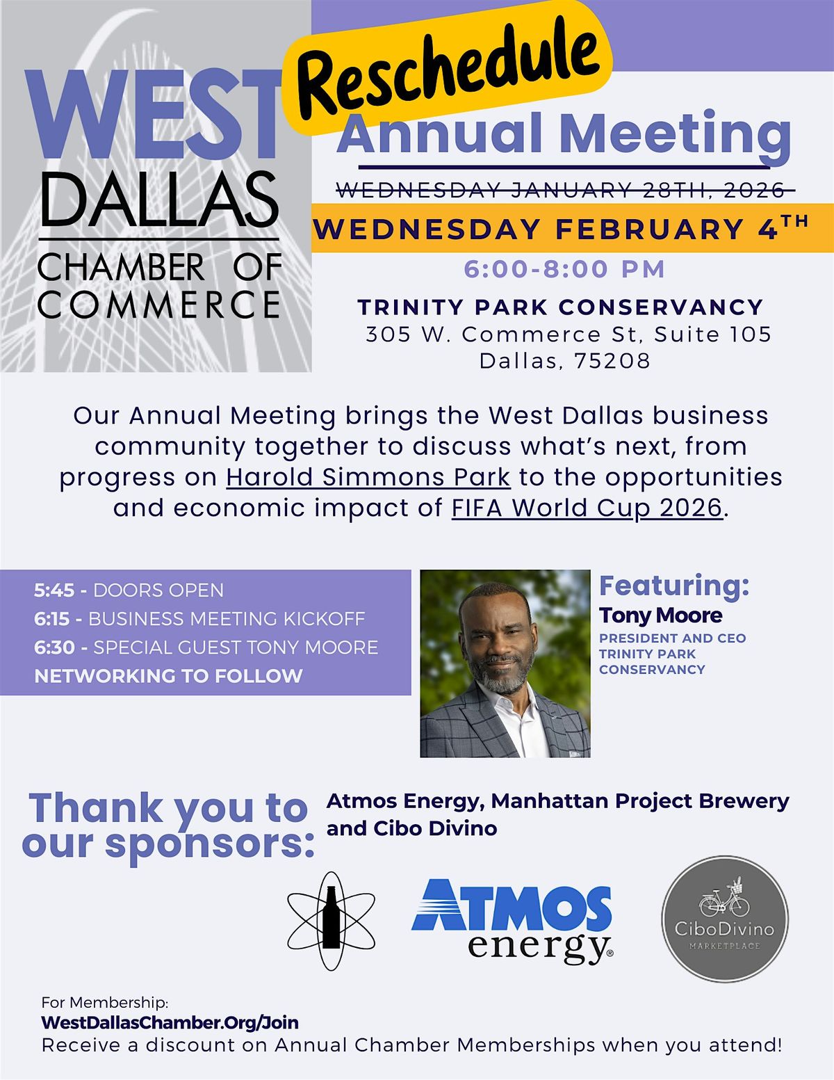 The business portion of the evening will be led by Chamber President Kara Rafferty, who will share updates on the Chamber’s initiatives, growth, and priorities for the year ahead. Following the Chamber update, we are honored to welcome our featured speaker, Tony Moore, CEO of Trinity Park Conservancy. Tony will provide meaningful insight into the continued progress of Harold Simmons Park and discuss the broader impact this transformative project will have on West Dallas and the region, especially as we approach the opportunities surrounding FIFA World Cup 2026.