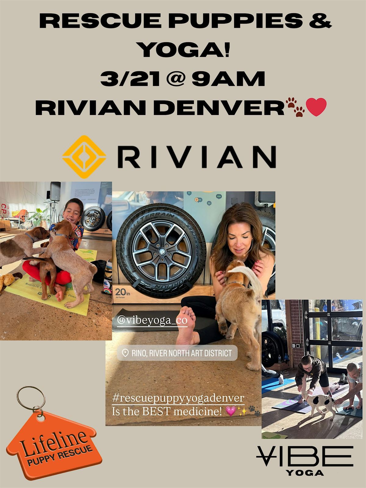 ‼️ We are partnering with Rivian Denver to raise money for this non-profit rescue organization and help get the puppies and dogs adopted! Every yogi flowing with Vibe contributes to finding these dogs their fur-ever homes. Thank you for your part in helping the dogs.