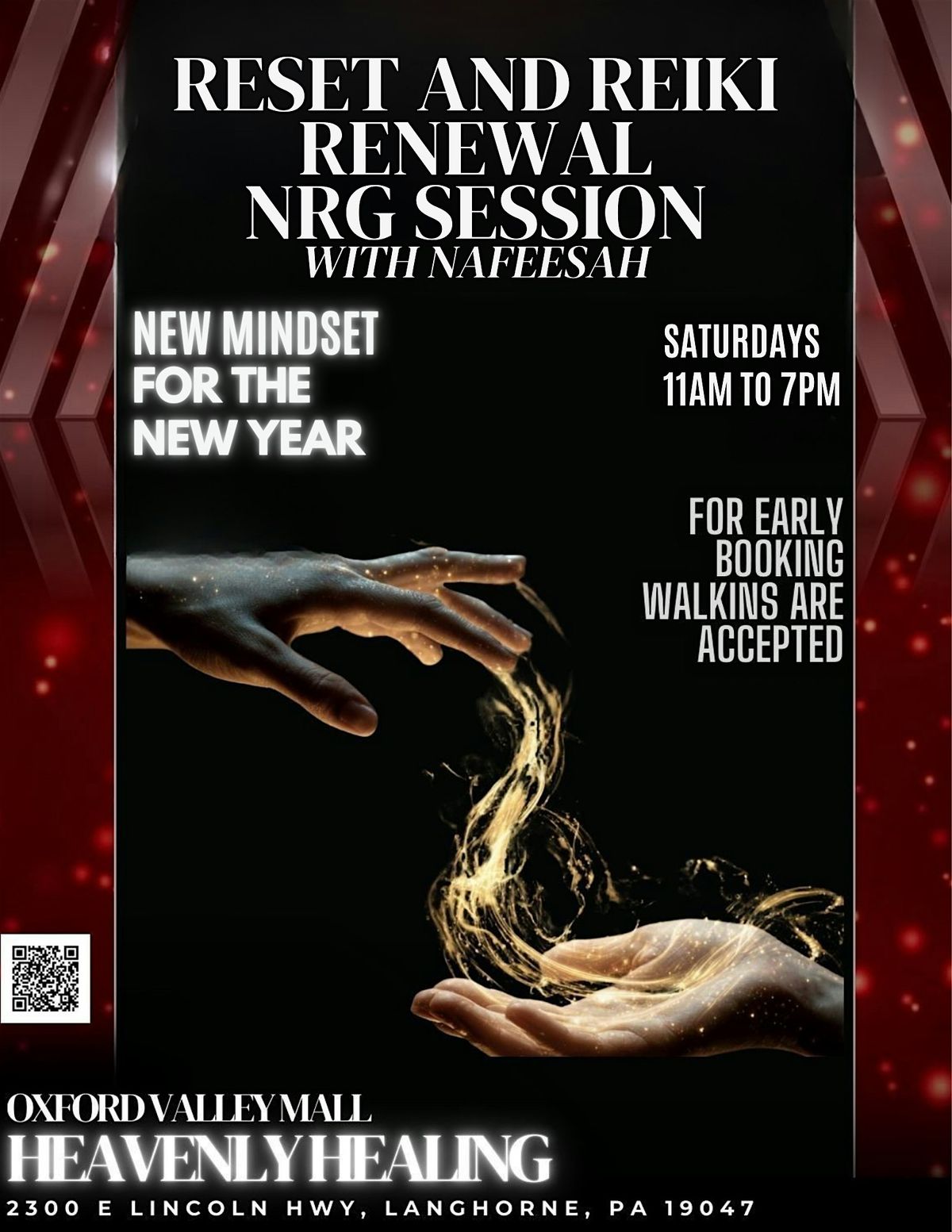 The Reset & Reiki Renewal NRG Session with Nafeesah is a grounding, restorative experience created to help you release stress, clear energetic heaviness, and reconnect with yourself. While this session is perfect for starting the new year with intention, it’s available regularly for anyone in need of calm, clarity, and renewal.