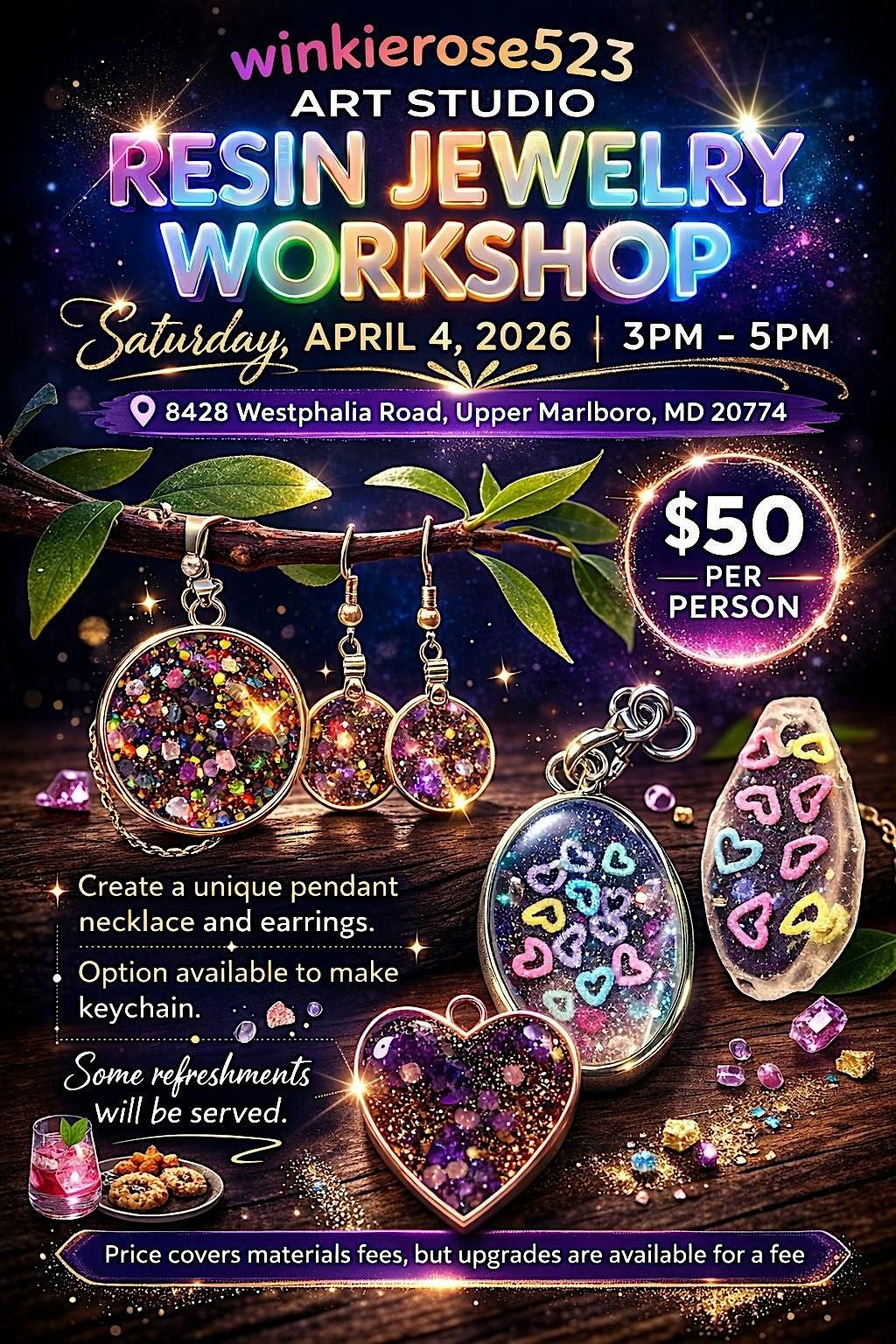Join us in person for a super fun Resin Jewelry Workshop! Get creative as you learn how to craft your very own stunning resin necklace and earrings. Whether you're a total newbie or just wanna sharpen your skills, this hands-on session is perfect. Come hang out, make some cool jewelry, and leave with unique accessories you'll love to wear or gift. Don't miss out on this awesome chance to get artsy and meet fellow jewelry lovers!