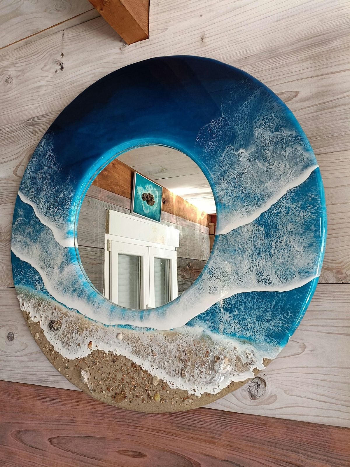 We provide resin, dyes, glass mosaic pieces, seashells, and even stones and crystals to make your mirror POP!